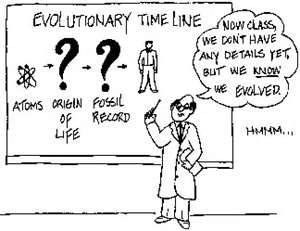- Sự Tiến Hoá từ Cá thành Người : nếu muốn vẽ gì thì vẽ thì dựa trên hình thể thì bất cứ sinh vật nào cũng có thể tiến hoá đến người, không nhất thiết là từ khỉ. Những hình loại này nếu đem nhồi sọ vào học đường để giảng dạy thì cũng thấy rất hợp lý: