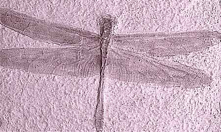 A fossil of Protolindenia wittei, a dragonfly with a wingspan of about 15 cm. This specimen comes from limestones of Bavaria, Germany, and is about 155 million years old
