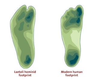 - Những hoá thạch trên đá tìm được 1979 gọi là Laetoli Footprints (Mary Leakey 1979) thì cổ xưa hơn bất cứ di tích đã tìm được của chủng loại Apes. Những dấu chân này đã xuất hiện trong hoá thạch 4 Triệu năm trước, họ đã có thân hình phát triển đầy đủ, đi hai chân. Các nhà Nhân Chủng Học sau khi khảo nghiệm đều nói rằng những vết chân này hết sức giống bàn chân của con người hiện đại.