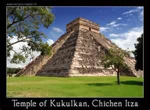 Kim Tự Tháp (KTT) Kukulkan (còn gọi là Chichen Itza) là một trong hàng chục cái do người Mayan (Việt ngữ) đã xây cách đây 3000 năm trước. Thời đại của họ kéo dài cho tới thế kỷ thứ 8 thì suy tàn và bỗng nhiên biến mất không để lại một dấu tích nào. Suốt 1800 năm dài, nền văn minh này vô cùng sáng chói rực rở, đã để lại nhiều vô số di tích đền đài cùng những điêu khắc, đồ gốm, tranh vẽ,... Người Mayan nổi tiếng nhất là Toán học, Thiên Văn, và ...Phi Cơ. Họ đã biết luôn Thái Dương Hệ đi hết một vòng Dãy Ngân Hà (Milky Way) là 25,625 năm, đúng như khoa học ngày nay xác nhận, mới thật đáng sợ. Năm 2012 vừa qua, nhiều nguời đã lo sốt vó vì Đại Lịch cho là tiên đoán tận thế.