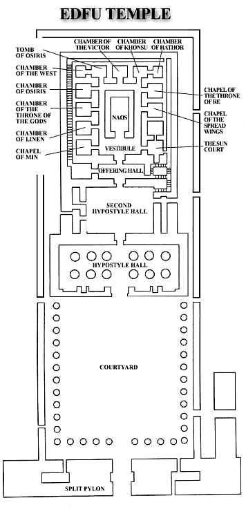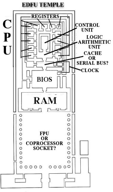 Nếu các bạn không tin tôi thì bấm đây "edfu temple floor plan" để xem sơ đồ chính thức của đền Edfu. Nếu quả thật cổ Ai-Cập có dụng ý gì thì đền này bên dưới nó sẽ là một khối máy điện toán để điều hành bộ máy nào đó. Cũng có thể đây là 'dư âm' còn sót lại từ Nền Văn Minh trước đó đã biến mất, hoặc chỉ là một sự trùng hợp, một sự trùng hợp hơi kỳ lạ.