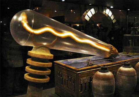 Trong Đền Thờ Hathor tại Dendera, cách Cairo 300 dặm, Ai Cập, có khắc hình vẽ trên đá 3 tấm hình rất là quái lạ mà những nhà nghiên cứu cho đó là hệ thống Đèn với kỹ thuật điện tử. Các bạn quan sát kỹ sẽ thấy chúng là một bóng dài và to, cuối đuôi đèn có sợi dây như dây điện nối dài với một vật hình chữ nhật đứng, giống như một bình điện.